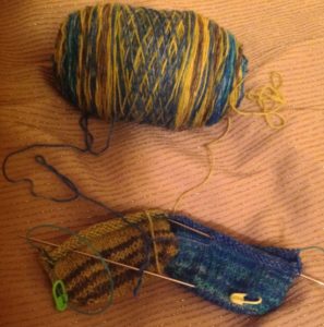 Yes, these are more socks. Two at a time, toe-up. My cast on was 32 stitches (divided between two needles) per sock. I ended with 56. Originally, I was going to go up to 62, but measuring against my foot, that would have been to big. Since I’m only using one yarn ball, these will be mismatched… which I adore. It’s sock weight merino yarn and I’m using my Hiya Hiya Sharp fixed circular needles, size 0.